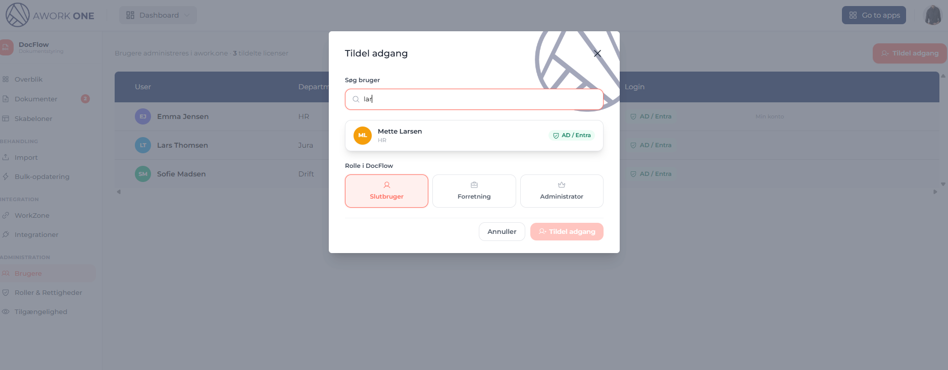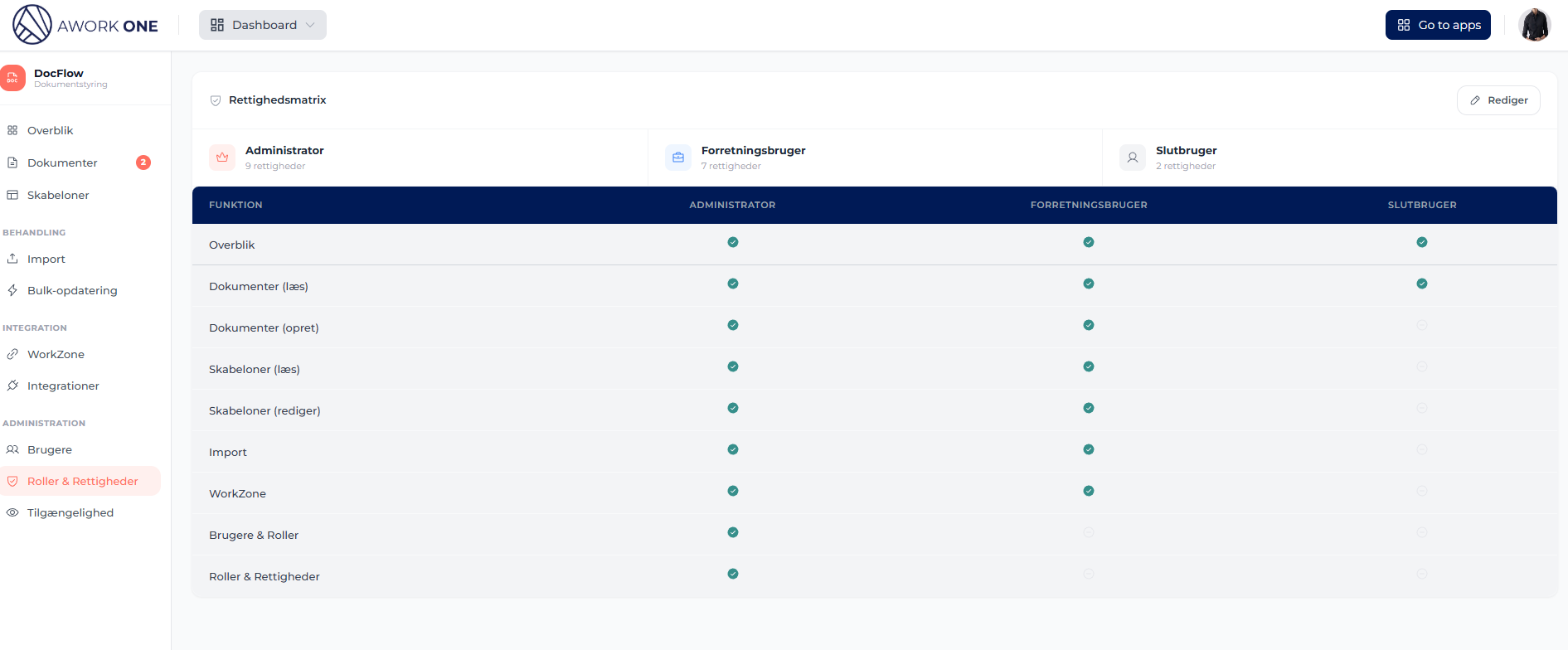 Med indbygget rolle- og rettighedsstyring kan du definere præcist, hvem der har adgang til hvilke funktioner og dokumenttyper. Det sikrer, at medarbejdere kun ser og arbejder med det, der er relevant for deres rolle, samtidig med at følsomme oplysninger beskyttes.