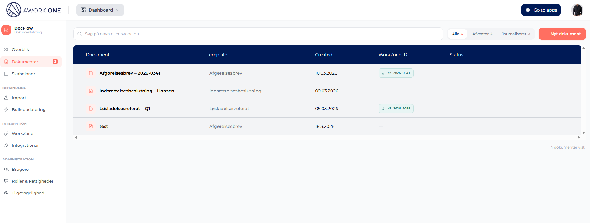 Du kan til enhver tid se, hvilke dokumenter der er under oprettelse, afventer godkendelse eller er færdigbehandlet. Samtidig får du overblik over, hvem der har oprettet, redigeret og godkendt hvert enkelt dokument, hvilket skaber transparens og sikrer sporbarhed i hele processen.