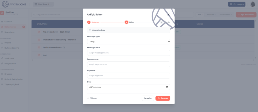 Data kan komme fra interne systemer, brugerinput eller integrerede datakilder, og dokumentet genereres øjeblikkeligt med korrekt indhold og struktur.