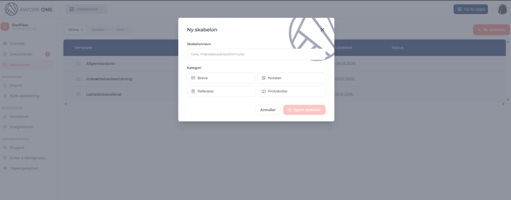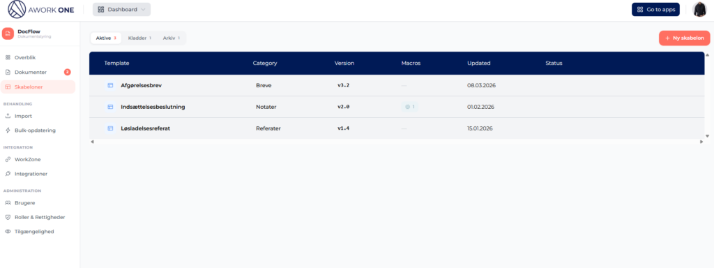 Alle dokumenter og skabeloner samles i én central løsning, hvor du har fuldt overblik over indhold, versioner og anvendelse.