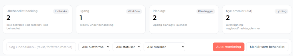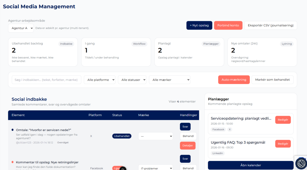 Systemet viser tydeligt, hvilke kommentarer og opslag der endnu ikke er besvaret eller håndteret. Det gør det nemt at prioritere opgaver og sikre rettidig opfølgning, også i større organisationer med mange brugere.