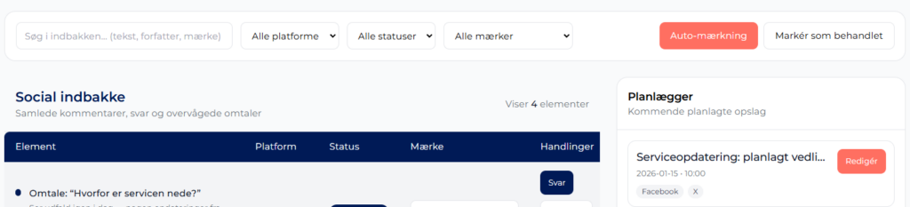 Alle kommentarer, svar og henvendelser samles ét sted. Det gør det nemt at bevare overblikket og sikre, at ingen dialoger bliver overset, uanset om de kommer fra Facebook, LinkedIn, Instagram, X eller YouTube.
